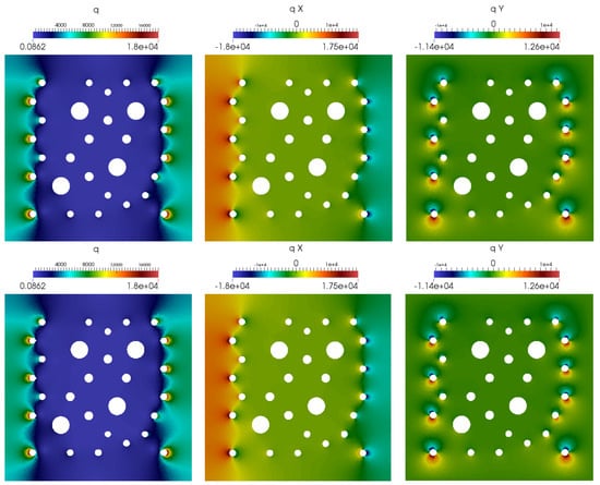 The distribution of the flux. Magnitude of flux, x and y components of flux, q, , (from left to right). (Top): Reference (fine grid) solution, = 155,580. (Bottom): Multiscale solution, (0.48% from ).