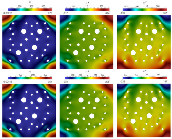 The distribution of the velocity. Magnitude of velocity, x and y components of velocity, u, (from left to right). (Top): Reference (fine grid) solution, = 433,384. (Bottom): Multiscale solution, (0.9% from ).