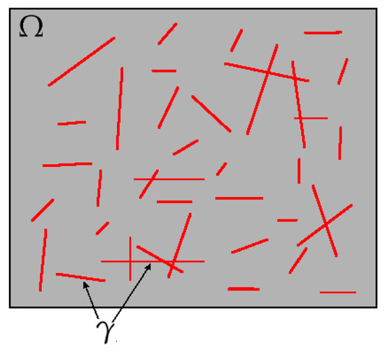We consider a problem in a fractured medium. Let is the bounded computational domain and is the fracture interface, (see Figure 1 for illustration). The elastic wave propagation is described by Helmholtz equation in the computational domain [21,22]