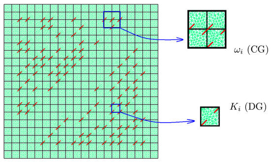 Figure 2. Coarse grid and local domains illustration for CG-GMsFEM and DG-GMsFEM. Fractures are depicted in red color. Structured coarse grid (black color). Unstructured fine grid (green color) with triangular elements that conformed with fractures. - for DG-GMsFEM, the local domain is the coarse grid cell , where and is the number of the coarse grid cells.