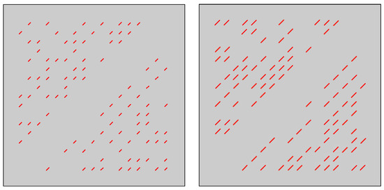 Geometry 1 and 2 with 100 straight fractures. Fractures are depicted in red color. Domain is depicted in gray color with m. Left: Geometry 1 with fractures length 10 m and orientation angle. Right: Geometry 2 with fractures length 20 m and orientation angle.