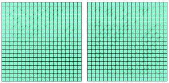 Relative errors are shown in Table 1 and Table 2 for two approaches proposed above and for two geometries (Figure 3). is number of unknowns in multiscale solver, M is the number of multiscale basis functions for CG-GMsFEM, and and are the numbers of multiscale interior and boundary basis functions for DG-GMsFEM, respectively. We observe that the larger number of multiscale basis functions can reduce errors.