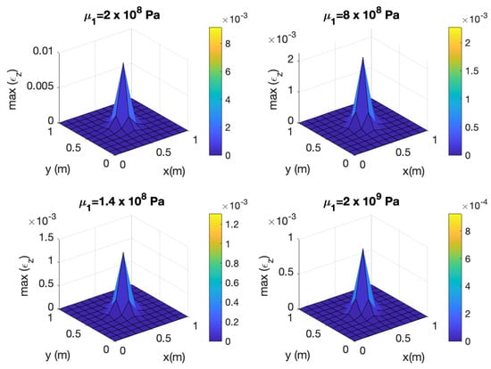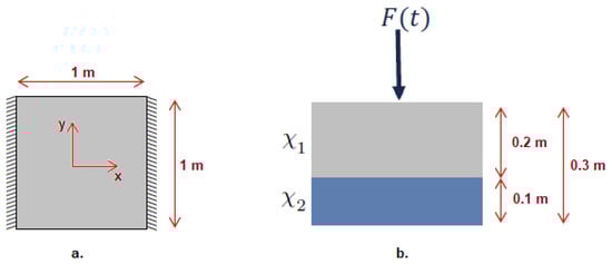 - Parametric update. In this case in Equation (32) everything is known except one of the functions depending on the frequency or the parameters , . Introduced into Equation (30) (after this last is integrated into all the variables except the one in which the unknown function is defined) and taking into account the arbitrariness of the associated test function, a scalar algebraic equation that allows calculating the searched function, is obtained.