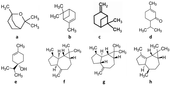 Two molecular dimensional structures of the eucalyptus compounds used in this study: (a) 1, 8-cineole (eucalyptus), (b) α-pinene, (c) β-pinene, (d) terpinen-4-ol, (e) piperitone, (f) allo-aromadendrene, (g) aromadendrene, and (h) α-gurjunene.