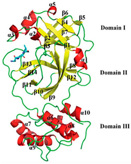 Three-dimensional structure of Mpro protein in complex with N3 inhibitor. It comprises three different domains.