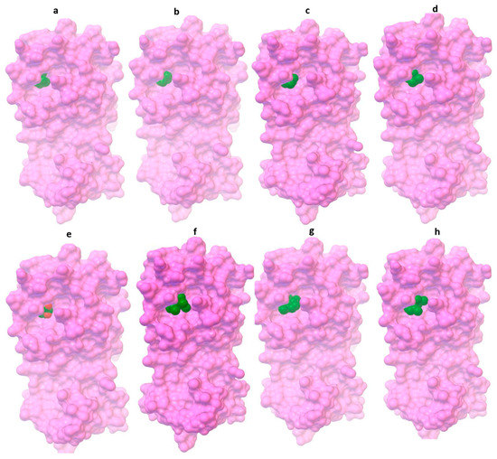 Docking structure of Mpro in complex with eucalyptus compounds: (a) 1, 8-cineole (eucalyptus), (b) α-pinene, (c) β-pinene, (d) terpinen-4-ol, (e) piperitone, (f) allo-aromadendrene, (g) aromadendrene, and (h) α-gurjunene.