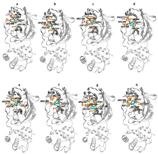 The residue of amino acids that led to the binding of Mpro and natural molecules was achieved through hydrophobic and hydrogen bond interactions. Molecular interactions generally play a significant role in forming and stabilizing docking complexes [40,41]. Hydrophobic interactions with eight amino acid residues (His41, Met49, Tyr54, His164, Met165, Asp187, Arg188, and Gln189) have been observed involving eucalyptus with the binding energy of −6.43 kcal/mol (−26.90 kJ/mol) (Figure 4a). The α-pinene compound made a complex through AutoDock with the binding energy of −6.27 kcal/mol (−26.23 kJ/mol). The hydrophobic interactions were formed by seven amino acid residues His41, Met49, His164, Met165, Asp187, Arg188, and Gln189 (Figure 4b). Nearly the same activity with the β-Pinene compound was observed in contrast to α-pinene with the addition of one amino acid residue, Tyr54 (Figure 4c). The binding energy of the terpinen-4-ol molecule was −5.71 kcal/mol (−23.89 kJ/mol), His164 residue formed a hydrogen bond, and six residues of His41, Met49, Pro52, Tyr54, Arg188, and Gln189 were associated in hydrophobic interactions (Figure 4d). Even though the terpinen-4-ol compound had less binding energy in all, it was found relatively useful to bind with active residues. The docked binding energy of the piperitone substrate was −6.1 kcal/mol (−25.52 kJ/mol). At the active site of Mpro, there was one hydrogen bond formation with His164, while eight amino acids were engaged in the formation of hydrophobic interactions (Figure 4e). The binding energy of allo-aromadendrene was −7.17 kcal/mol (−29.99 kJ/mol) and it interacted with nine amino acid residues (His41, Met49, Tyr54, Cys145, His164, Met165, Glu166, Asp187, Arg188, and Gln189) in the active site of SARS-CoV-2 Mpro. These residues participated in hydrophobic interactions (Figure 4f). The compounds aromadendrene and α-gurjunene with binding energies of −7.23 kcal/mol (−30.25 kJ/mol) and −7.34 kcal/mol (−30.71 kJ/mol) formed van der Waals interactions with seven specific amino acid residues (His41, Met49, Cys145, Met165, Asp187, Arg188, and Gln189). Such molecules had the strongest binding energies in contrast with six other molecules (Figure 4g,h). Earlier studies support our findings by reporting similar amino acid residues to SARS-CoV-2 Mpro protein interactions with other ligands, as confirmed in our study [16,29,42,43,44].