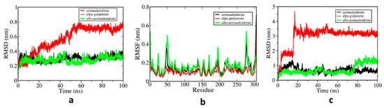 Classical MD simulations are one of the computer simulation techniques for atomic resolution dynamic molecular data [45]. The three natural compounds (α-gurjunene, aromadendrene, and allo-aromadendrene) in complex with Mpro protein underwent MD simulations of 100 ns to evaluate the interactions in more detail and the per residue energy contributions of each amino acid. To evaluate the stability of the selected structures, the root mean square deviation (RMSD) of protein and ligand was calculated for 100 ns trajectories. In addition, the root mean square fluctuation (RMSF) values for each residue were analyzed to assess the local flexibility.