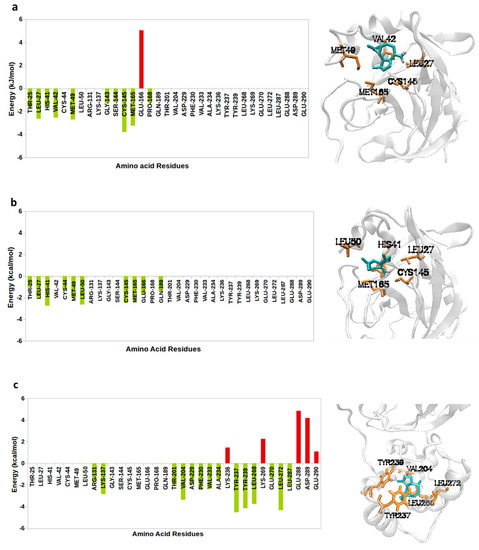 Per residue energy contributions (in kJ/mol) of the inhibitors. Red bars represent amino acids with unfavorable binding energies while light green bars represent amino acids with favorable binding energies; (right) final molecular dynamics (MD) snapshots of the major residues that contributed to the binding of Mpro in complex with (a) allo-aromadendrene, (b) aromadendrene, and (c) α-gurjunene.