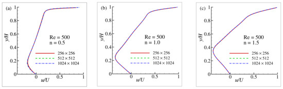 A square lid-driven cavity flow was considered to test the MPL model using the SRT lattice Boltzmann (LB) simulation for and 500 where and H indicate the maximum lid velocity and the height of the cavity, respectively. At the top wall of the cavity, a moving boundary condition was applied as , where and for the rest of the walls, a well known bounce-back condition was applied (for no slip walls). Before going to the code validation, firstly a grid-sensitivity test (GST) has been done in terms of the horizontal u velocity components for the maximum Reynolds number , with three different grid orientations; case 1: , case 2: , and Case 3: . The GIT results are illustrated in Figure 2a–c for the power-law indexes , 1, and , respectively. From these figures, it is clearly evident that the flow is grid independent. For , a lattice size of is considered in the present simulation and the obtained numerical results are depicted in Figure 3 for , and .
