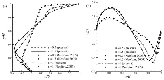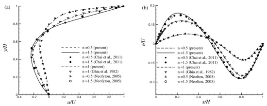 In Figure 3a,b, the results obtained from the modified power-law (MPL) are compared with the available results of from the traditional power-law (PL) model for by Chai et al. [29], Neoftou [3], Bell and Surana [2], and Ghia et al. [64]. Results show an excellent agreement with the available results published before. In Figure 4a,b another comparison is shown in terms of the velocity distribution for with the Newtonian and non-Newtonian fluids. For , a lattice size of has been used for the simulation and the results exhibit very good agreement with the results of Neoftou [3].