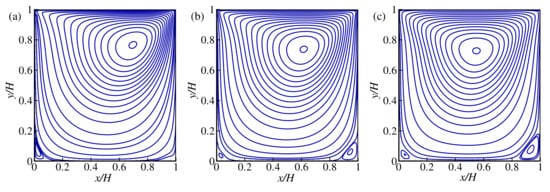 Figure 5a–c and Figure 6a–c show the flow feature in terms of the streamlines for and 500, respectively. Figures show the results for the case of shear-thinning (), Newtonian (), and shear-thickening () fluids. It is apparent from the results that the core of the primary vortex has appeared near the driven lid. Besides the primary vortex, a secondary and tertiary vortex has emerged in the right and left bottom corners of the cavity with increasing the values of power-law index n. That happened because increasing the values of n led to increased viscosity inside the fluid, leading to the emergence of the corner vortex. It is also apparent that for larger , the size of the corner vortex increases.