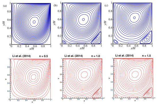In Figure 6, there is a quantitative comparison in terms of the streamlines for the different power-law indexes, which means direct comparison with the published results by our numerical data. Qualitative comparison implies a comparison of two figures keeping side-by-side, and by inspection; it can be decided whether they look similar or not. A wualitative comparison of the streamlines with the results of Li et al. [32] for the lid-driven cavity flow was done while , and it shows that the agreement is good indeed. To support this qualitative comparison, again, a quantitative comparison is made by calculating the center of the primary vortex shown in the Table 2 and found excellent agreement with the available published results in the literature.