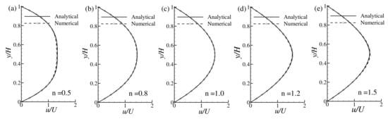 where U is the average velocity, the numerical result in terms of the stream-wise velocity obtained from LBM is compared with the analytical results obtained by Equation (24) for the power-law non-Newtonian fluids. Figure 7a–e show the axial velocity distributions for the different power-law index such as and respectively, while . The comparison in the figure shows that the numerical results establish an excellent agreement with the analytical results.