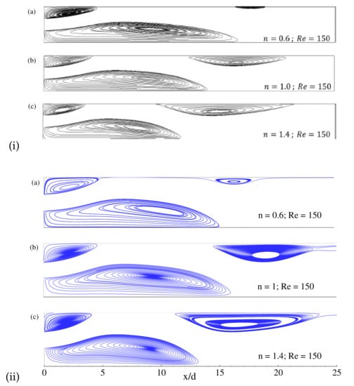 There are no results available for the non-Newtonian power-law fluids in a backward-facing step while , so it is not possible to show a direct comparison for the code validation. Instead of the backward-facing step, for the power-law fluids, , a qualitative comparison is shown in terms of the streamlines with the results of power-law non-Newtonian fluids flow in a sudden expansion channel obtained by Ilio et al. [65] and depicted in Figure 8. Here the boundary conditions, the aspect ratio of the inlet and channel height (, where H is the channel height and d is the length of the inlet), and the length of the upstream and downstream regions are kept as same as Ilio et al. [65]. Based on Ilio et al. [65] study, the lattice size is chosen for this comparison. From these figures, it can be concluded that the comparison showed a good agreement.