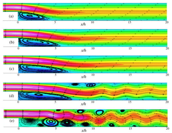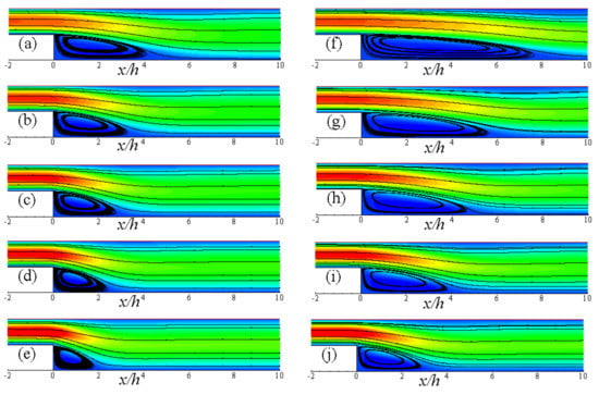 - Erturk, E. Numerical solutions of 2-D steady incompressible flow over a backward-facing step, Part I: High Reynolds number solutions. Comput. Fluids 2008, 37, 633–655. [Google Scholar] [CrossRef]