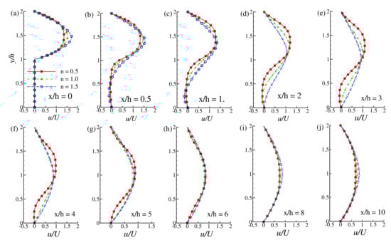 Velocity distribution at the different axial locations of the downstream region while and n (=0.5, 1.0, 1.5).