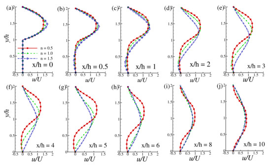 It is possible to find numerous studies in the literature considering the flow in a backward-facing step. However, still, there is a lack of tabulated data in hand. In this study, the results are presented in tabular form in order to facilitate the comparison. Table 5 and Table 6 present the tabular values of u-velocity profiles for and 400, respectively, and for different values of power-law index across the channel at different location , , and .