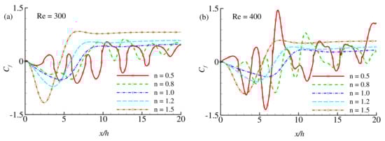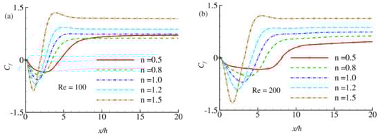 The effect of the power-law index n (=0.5, 0.8, 1.0, 1.2, and 1.5) on the wall shear stress is investigated in terms of the local skin-friction coefficient as displayed in Figure 14a,b and Figure 15a,b for different Reynolds numbers, , and 400. Here is considered for the present numerical simulation. The effect of the power-law index is visible on the wall shear stress. It is known that increasing the values of n leads to increased fluid viscosity and, consequently, enhances the wall shear stress intensity. The phenomena are quite apparent in Figure 14. Results show that increasing the power-law index leads to a decrease in the re-circulation zone where due to the negative velocity near the wall. Within the re-circulation zone, gets stronger in the negative direction with increasing the power-law index . After the flow gets reattached to the wall, becomes stronger in the positive direction for shear-thickening fluids than the Newtonian and the shear-thinning fluids . For , the intensity of the wall shear stress increases in magnitude in the re-circulation zone, while decreases in the next reattachment region for all types of fluids. Further increasing the Reynolds number to and , as shown in Figure 15, the wall shear stress show periodic nature for shear-thinning fluids as there exist several re-circulation zones and reattachment region along the bottom wall for these fluids. The feature of shear-thickening fluids showing higher wall shear stress in magnitude still present for . For , the amplitude of the periodic nature of for shear-thinning fluids gets stronger. In this case, becomes higher for shear-thinning fluids than the shear-thickening fluids at some regions on the wall shear stress. We assume that at , shear-thinning fluids do not behave like laminar rather transitional. It is found that with increasing the values of , the shear-thickening fluids exhibit less intensity of wall shear stress, but the shear-thinning fluids tend to show the periodic nature of wall shear stress with increasing amplitude.