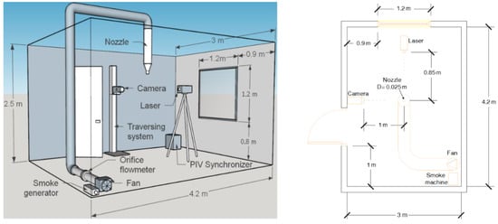 Jet flow issued from a specially designed smooth contracting nozzle (diameter, D = 0.025 m) was investigated. The nozzle was a 5th polynomial, designed to the specifications similar to the ones by [19,20], with the exit section coinciding with the point where the tangent is parallel to the nozzle axis. Particle image velocimetry (PIV), 2 dimensional–2 components, measurement method was used for data acquisition of the whole flow vector field under isothermal conditions in a climate control chamber with dimensions of 3(W) by 2.5(H) by 4.2(L) [m3] at the University of Gävle; a similar setup and the same room used in an earlier study [9]. The nozzle setup was vertically mounted and installed in the middle of the room at 2 m from the floor, a schematic and plan representation of the setup is shown in Figure 1.