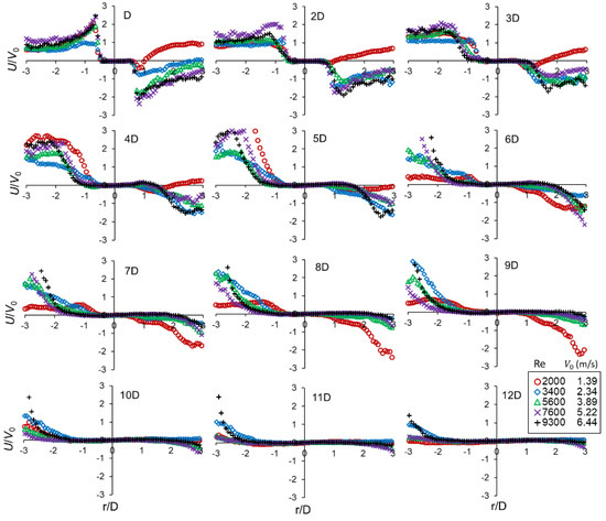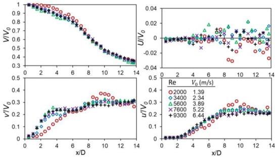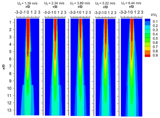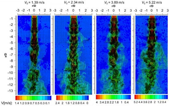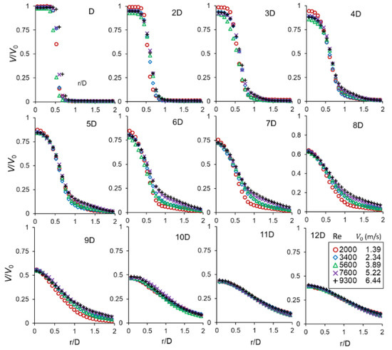 A time averaged quantitative characterization of the streamwise velocity profiles are presented in Figure 4 and, as observed, in all cases a top-hat profile typical of free round jets [26,27,28] was obtained. The exit top-hat velocity profiles diffused out gradually to a Gaussian profile within the first four diameters and with increase in downstream distance the velocity distribution eventually relaxes to bell-shaped profiles [29]. An apparent observation is that the velocity profiles are superimposed on each other up to 4D, with the exception of the case with the lowest nozzle exit velocity (sustains the exit velocity longer than other cases). After the zone of flow establishment, the Reynolds number dependence manifests between six to nine diameters which may be deduced as part of a critical transitional region where the jet changes from laminar to turbulent flow. Here, increase in exit velocities suggest increase in the radial spread (width of the jet) with downstream distance. However, after 10D the profiles exhibit self-similarity as they are superimposed on each other again for the rest of the interrogation region (shown here only up to 12D). This observation is supported by the qualitative representation of the mean flow field shown in Figure 5.