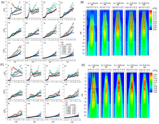 The contour plots show that the streamwise r.m.s fluctuations () peaks in the jet mixing layer along the nozzle lips (about r/D ≈ 0.5) and grows stronger towards the nozzle exit with increasing exit velocity. In setups with V0 ≥ 5.22 m/s, a strong jet mixing layer is uniformly sustained downstream up to about x/D = 7 after which it gradually disintegrates to an asymptotic flow. Similarly, the spanwise r.m.s fluctuations (u′) peaks along the nozzle lips but the fluctuations grow inwards towards the jet centerline. In both Figure 7B,D, the inward growth and merging of the shear layer introduce fluctuations along the central portion of the jet consequently increasing entrainment and the mixing processes between the jet and the ambient.