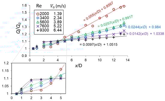 When the jet entrains fluid from outside the jet boundaries into the main turbulent stream, the volumetric mass flowrate increases with increasing downstream distance from the jet exit [32]. Figure 9 shows the change of the volumetric flowrate with downstream distance. The volumetric flowrate in the near field develops nonlinearly and depend on the exit velocity reaches a constant within the first 4D. In higher exit velocity flows, there is a sharp increase in volumetric flowrate and quickly reaches a constant as compared to flows with low exit velocities. The general overview shows that conditions with high exit flows have low mass flowrate increase which is a consequence of low entrainment compared to conditions with low nozzle exit velocities.