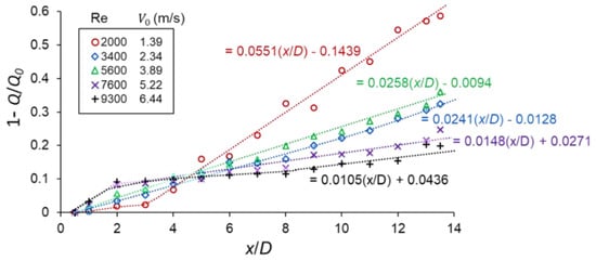 Hypothetically, if there is no fluid entrained into the jet flow then jet mixing = 0. On the other hand, when the jet mixing = 1, then flow is fully mixed with the surrounding fluid. Table 2 shows a comparison of the estimated downstream distance for fully mixed jet flow: With the graphical method (Figure 11) and the proposed relationship where is the function of the downstream distance from Figure 9.