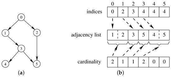 Figure 1a. As an example, in order to iterate through the children of node 3, we would have to access the 2 elements of the adjacency list array starting from the node at position 4, since the cardinality of node 3 is 2 and the first children is in position 4. We also point out that, traditionally, the array storing the cardinalities is not necessary, since these cardinalities can be computed through two accesses to the array storing the indices. Unfortunately, GPU architectures set a high price for sequential accesses on consecutive array elements by the same thread. Thus, in our application, it is preferable to retrieve the cardinality using one extra array.