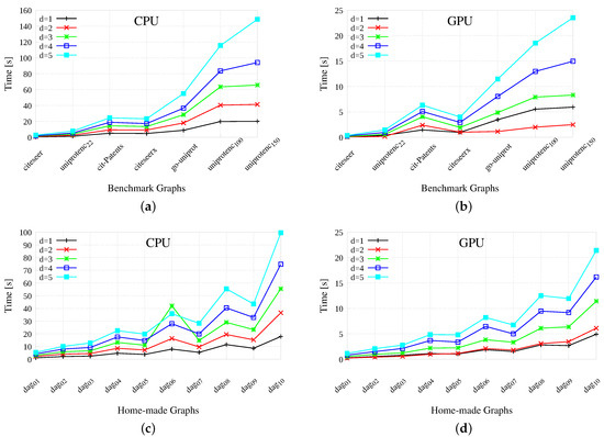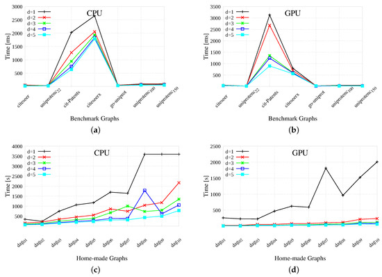 Figure 6. The time reported on the plots include both the time spent to pre-check the label pairs on the CPU plus the time spent to perform graph visits on the GPU. As far as the speed-up is concerned, we are about