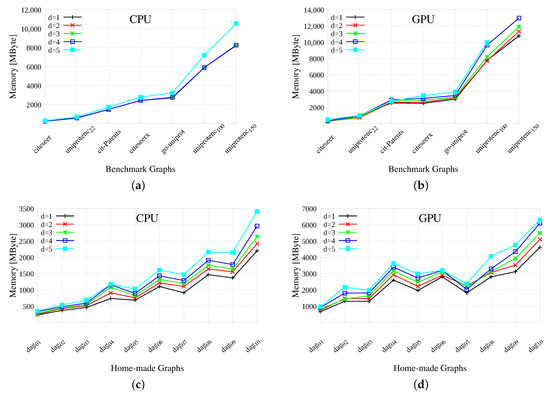 Figure 5 reports a comparison between the original CPU-based implementation and the GPU-based one in terms of memory requirement. Our GPU procedures were carefully designed to maximize the execution regularity, thus avoiding reiterated calls to memory allocation and repeated data transfer from and to the CPU. To reach this target, we simply resort to the algorithmic structure in which the output of each breadth-first visit is given in input to the next one, thus we can pre-allocate and keep most of our data structures in the GPU’s global memory until they are no longer necessary. Following the Enterprise library approach [