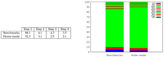 Figure 7 reports some insights on the costs of the different steps of Algorithm 2 and the CPU-to-GPU relationship during the labeling phase flow. Each column of the table indicates the time required by the corresponding phase as a percentage of the total wall-clock time necessary to the GPU to complete the entire labeling phase. The table reports the data averaged over all benchmark and home-made graphs considered separately. As it can be noticed, for both graph sets, the majority of the time is spent in the first phase, to transform a DAG into a DT. This phase runs slightly faster on the sparse (and smaller) graphs since in these cases fewer edges must be discarded. The other three phases run with a certain equilibrium, as they require much less computation effort than the first phase. The histogram considers the same statistics embedded in the overall computation activity including the CPU. As in the previous case, we report percentage data averaged for the benchmark and the home-made graphs. The initial bar (blue color) is the time required by the CPU to read the graph from the file and to initialize all data structures. Red bars consider memory transfer, memory allocation, reallocation, and memory adjustment times. These are higher for larger graphs and after the initialization phase and smaller between the different more GPU-intensive steps.