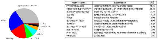 https://developer.nvidia.com/tools-overview).). The pie chart reports the main reasons that force our working threads in a stall situation. Minor causes (i.e., from the “warp not selected” item on) are only reported in the table and not in the pie chart. The pie chart shows that the three primary stall reasons for our application are synchronization, execution dependency, and memory dependency. These strongly depend on the principle of data locality and the branch divergence.