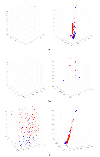 Initial categorical input space taking three attributes (left) and mapped features with Chi-tSNE (right) for: (a) Congressional Voting Records, (b) Balloons, and (c) Breast Cancer. Red and blue dots correspond to class 1 and 2, respectively. Each dimension of subfigures is a random feature.