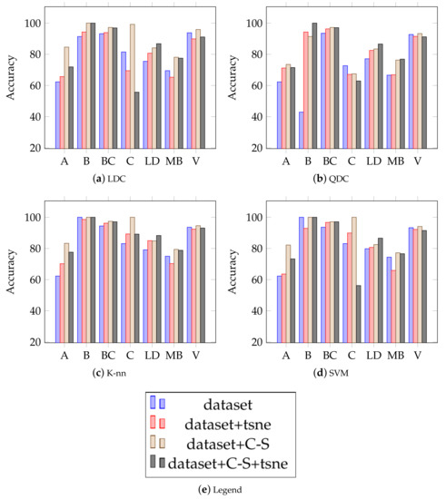 Classification results (accuracy) for several distances of the t-SNE algorithm over seven UCI public datasets. LDC and QDC correspond to linear and quadratic Bayesian classifier, K-nn stands for K-nearest neighbor and SVM is the support vector machine. The datasets: A, B, BC, C, LD, MB, V are defined in Table 1.