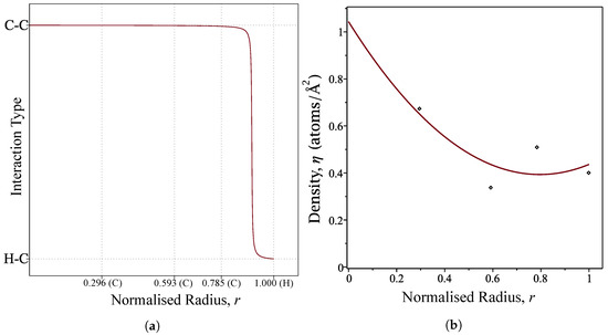 (a) Profile of the interaction function over the normalised radius of the coronene molecule where (C) and (H) denote the location of a carbon and hydrogen atoms, respectively; and (b) profile of the density function over the normalised radius of the coronene molecule.