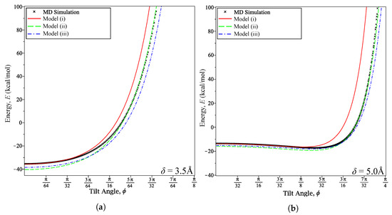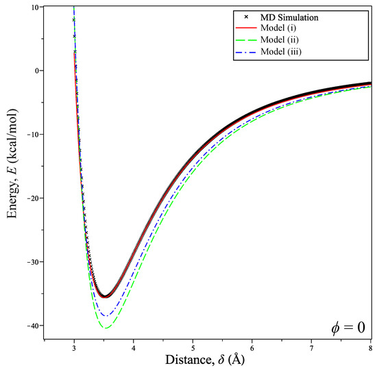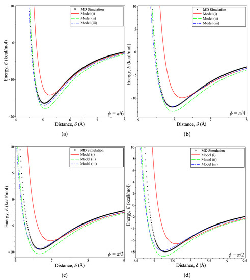Fixing the tilt angle at implies that the coronene molecule lies parallel to the graphene sheet. As seen from Figure 3, the differences in the energy profiles obtained from the three models are obvious. Here, Model (i) agrees excellently with the MD simulation, whereas Models (ii) and (iii) using interaction functions have discrepancies. We find that this is due to Model (i) and the atomistic case being equal when the coronene is parallel to the graphene sheet, which is shown in Appendix B.