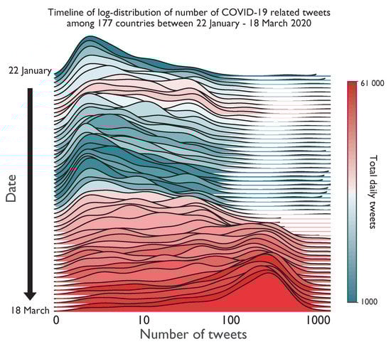 We primarily utilized two data sources for our study, that is, daily number of officially reported COVID-19 infections and deaths from “COVID-19 Data Repository” by the Center for Systems Science and Engineering at Johns Hopkins University [] and daily count of COVID-19 related tweets from Twitter []. A 57 day period between 22 January–18 March 2020 is chosen for this study to represent the early stages of the pandemic when disease characteristics are less known and public panic is elevated. We collected 954,902 tweets that have location information from Twitter by searching for #covid19 and #coronavirus hashtags. Similar to other studies [,,], geolocation of the tweets is inferred either by using user geo-tagging or geo-coding the information available in users’ profiles. Timeline of daily log-distribution of collected tweet counts among 177 countries can be examined from Figure 1. The trend shows an increasing prevalence of high daily number of tweets as the pandemic spreads across the globe with time.
