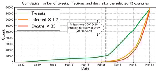We select the following 12 countries for our causal modeling analysis: Italy, Spain, Germany, France, Switzerland, United Kingdom, Netherlands, Norway, Austria, Belgium, Sweden, and Denmark. These are the countries with substantial number of reported COVID-19 cases (listed in descending order) in Europe as of 18 March 2020, yet still exhibiting a high diversity in terms of the timeline of the pandemic. For instance, while Italy located further in the pandemic timeline due to being hit first in Europe, United Kingdom could be considered in the very initial stages of it for the analysis period of our study. Figure 2 depicts the cumulative number of tweet counts alongside with that of reported infections and deaths for the selected countries. Evident correlations between these variables can be noticed. A sharp increase in Twitter activity is observed after 28–29 February, which corresponds to the period of each country having at least one confirmed COVID-19 case.