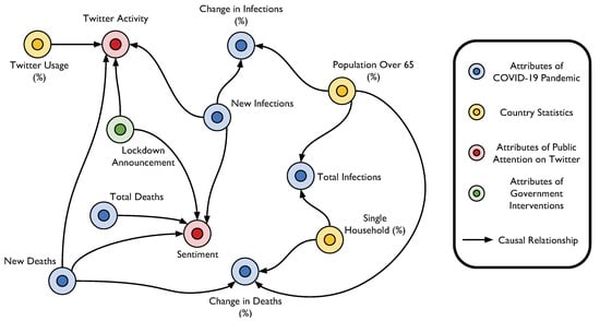 Themes of previous studies that focus on exploration of, description of, correlation of, or predictive modeling with Twitter data during COVID-19 pandemic include sentiment analysis [,,,,], public attitude/interest measurement [,,,], content analysis [,,,,,], topic modeling [,,,,,,], analysis of misinformation, disinformation, or conspiracies [,,,,,,], outbreak detection or disease nowcasting/forecasting [,], and more [,,,,,]. Similarly, data from other social media channels (e.g., Weibo, Reddit, Facebook) or search engine statistics are utilized for parallel analyses related to COVID-19 pandemic as well [,,,,,,,,,,,,,,,,]. While these studies reveal important information and patterns, they do not attempt to uncover or model causal relationships between the attributes of COVID-19 pandemic and social media activity. As correlation does not imply causation (e.g., spurious correlations), the ability to identify truly causal relationships between pandemic characteristics and public behaviour (online or not) remains crucial for devising public policies that are more impactful. Without causal understanding, our efforts and decisions on risk communication, public health engagement, health intervention timing, and adjustment of resources for fighting disinformation, fearmongering, and alarmism will stay subpar.