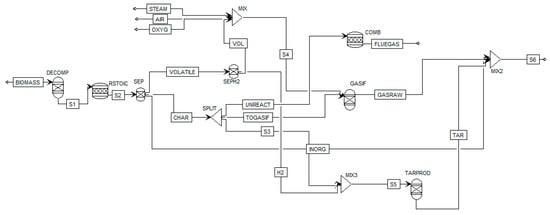 Aspen Plus, a chemical engineering process optimization software developed by Massachusetts Institute of Technology (MIT), uses unit operation blocks, such as reactors, columns, pumps, heat exchangers, etc. The unit blocks are connected by material and energy streams in a flow sheet workspace, utilizing sub-sequential modular approach and in-built physical property databases []. Although Aspen Plus presents thermodynamic (e.g., GIBBS, i.e., reactor based on the minimization of the free Gibbs energy) and kinetic (e.g., RYIELD, i.e., a simple kinetic reactor based on the reaction yield) reactors, it is typically used for thermodynamic simulation. In order to obtain results closer to experimental values also in thermodynamic equilibrium models, many authors adopt the quasi-equilibrium approach. This approach was introduced by Gumz [] and it is based on the use of QET (Quasi-Equilibrium Temperature) at which the specific chemical reaction is assumed to reach equilibrium [], instead of the actual operating temperature of the reactor. This approach does not require specific information regarding the dimensions, capacity and structure of the gasifier but only a set of experimental data. Doherty et al. [] used the quasi-equilibrium approach based on Gibbs free energy minimization and the restricted equilibrium method to calibrate it against experimental data by the specification of a temperature approach for the gasification reactions. In this way the model was able to evaluate all the main gasification parameters (syngas composition, conversion efficiencies and heating values) and the effect of several variables (like gasification temperature and equivalence ratio (ER, defined as the ratio of the actual fuel/air ratio to the stoichiometric fuel/air ratio)) on such parameters. Arteaga-Pèrez et al. [] implemented a quasi-equilibrium biomass gasification system and, by changing the gasifier temperature and the air factor, identified that the maximum yield of syngas is achieved at 850 °C and at air ER equal to 0.3. Mirmoshtaghi et al. [] built a model for biomass gasification in a fluidized-bed gasifier with air oxidant with QET, predicting the volume fraction of the major components (hydrogen, carbon monoxide, carbon dioxide and methane) in product gas. The temperature range of the gasification was set to 730–815 °C, with an ER between 0.22 and 0.53. Giuliano et al. [] describes the biorefinery process by Aspen Plus, using corn stover as feedstock. Due to the lack of flexible and fast but also accurate models of biomass gasification usable with all the combinations of oxidizing agents, the authors, in Marcantonio et al. [], have developed a biomass gasification model that is based on the Gibbs free energy minimization. The approach followed included the restricted quasi-equilibrium approach via data-fit regression from experimental data. The simulation results achieved, taking into account several mixes of gasifying agents, were compared and validated against experimental data reported in literature. The values obtained by the developed simulation are in good agreement with literature data. Thus, Aspen Plus is widely applied to the biomass valorization processes but, up to now, no specific comparison has been done between the gas composition resulting from a Aspen plus thermodynamic (with experimental calibration) model and a kinetic model (normally done via MATLAB).