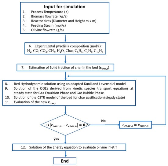 Steam gasification is normally done via fluidized bed gasifier that can allow the recirculation of materials in order to provide the necessary heat for the gasification reactions. Thus, the reactor design is a simple cylinder. Details of the model can be found in Di Carlo et al. []. It is a semi-empirical model for steam gasification which implements a 1-D resolution of the mass and energy balance along the axis of the cylinder in order to calculate the syngas composition. In this model, the pyrolysis reactions were considered instantaneous, because the operating temperature is quite high in the gasifier where biomass is fed. For this reason, the de-volatilization time was considered negligible, assuming that biomass is instantaneously converted in its de-volatilization products. In order to obtain realistic values for the pyrolysis products and to validate the biomass steam gasification model, experimental tests on a bench scale fluidized bed reactor were used []. A hydrodynamic model according to Kunii and Levenspiel [] (Geldart group B powder) was used to describe the bubble and emulsion phases and their interaction in the fluidized bed. The rates of the gasification reactions (heterogeneous and homogeneous reactions, including one-ring tar reforming) have been implemented using literature kinetic correlations []. In Figure 2 the MATLAB algorithm flow chart is illustrated, more details of the model can be found in the works of Di Carlo et al. [,].