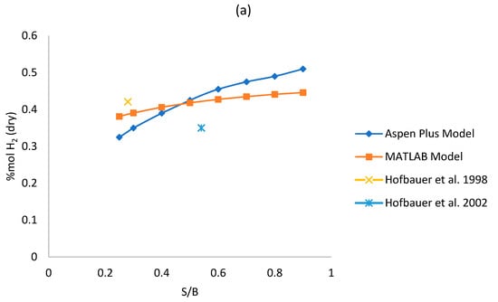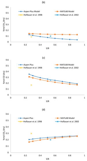 For S/B = 0.5 (kgsteam/kgbiomass,dry) from the comparison of the experimental values obtained by Hofbauer [] using 0% of nickel catalyst and quartz as bed material it is possible to observe the good correspondence of the developed models for CH4, CO and CO2 (Aspen Plus maximum AE 4 and RE 31%, MATLAB maximum AE 3 and RE 31%). Instead the H2 is overestimated (Aspen Plus maximum AE 8 and RE 23%, MATLAB maximum AE 7 and RE 21%) mainly because the Aspen Plus model, under equal uncatalyzed conditions, considers equilibrium conditions meanwhile MATLAB overestimates the steam reforming of tars, both factors that increase the H2 content of the syngas at higher S/B. At S/B 0.5 the LHV, yield and cold gas efficiency are in good agreement (maximum AE −3 and RE +32%), the LHV of the MATLAB model, in this case, is in a better agreement (AE −0.45 and RE −3%) respect to Aspen Plus (AE −2.95 and RE −20.13%) since it considers the reforming of tars.