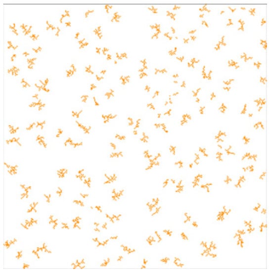 Section 1. As the aggregation model, the MultiDLA model was chosen using the cellular automata approach. This model belongs to the class of PCA aggregation models and is an extension of the diffusion-limited aggregation (DLA) model. As in any PCA model, in DLA, a stationary particle is placed on the field, which is the center of clustering, and other particles moving in field aggregate with it, forming a single branched cluster. A feature of DLA is that it models the motion of a particle caused by diffusion. A particle appears in a random place and moves randomly, changing the direction of motion at each step of its path [