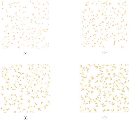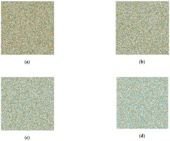One of the main input parameters of the catalytic reaction model is the digital structure of the porous catalyst. The porosity of the structure can be obtained from the experimental conditions. The number of cluster centers was set as 5% of the total number of cells with a catalyst, which allows a branched structure to be generated. In the studied reactions, the following catalyst ratios were used—40, 80, 120, and 160 g per 1 kg of aniline layer. In accordance with these data, four three-dimensional digital porous catalyst structures were generated using the model described in