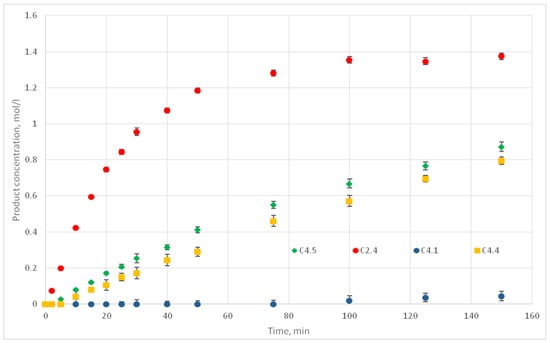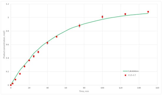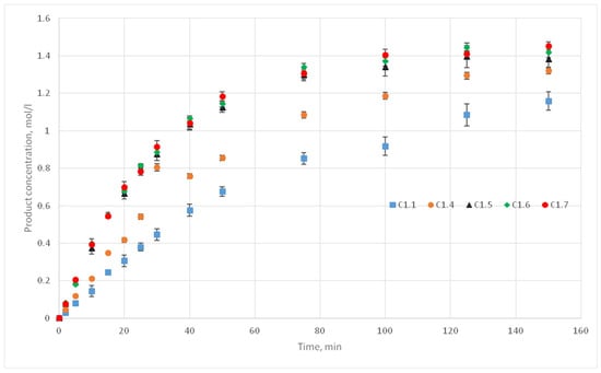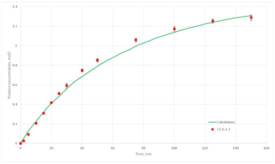 Figure 10 shows the corresponding kinetic curves with the confidential intervals for each experimental point. For each experiment (C1.1, 1.2, 1.3; C1.4; C1.5; C1.6; C1.7, 1.8, 1.9) three kinetic curves were obtained.