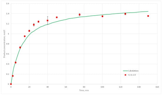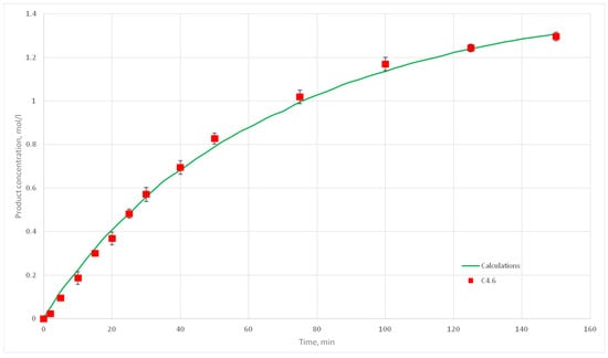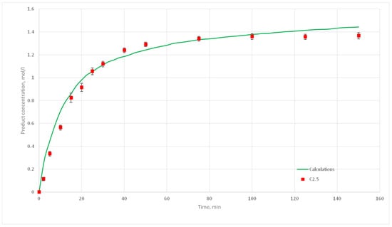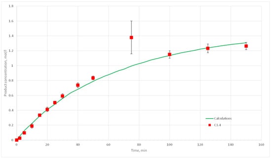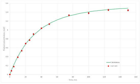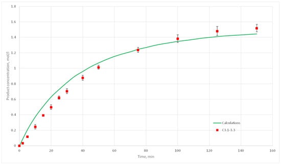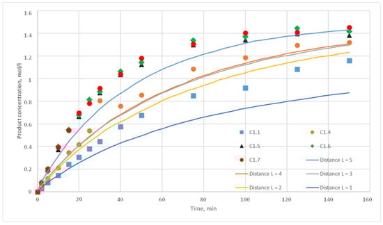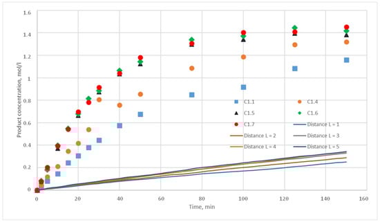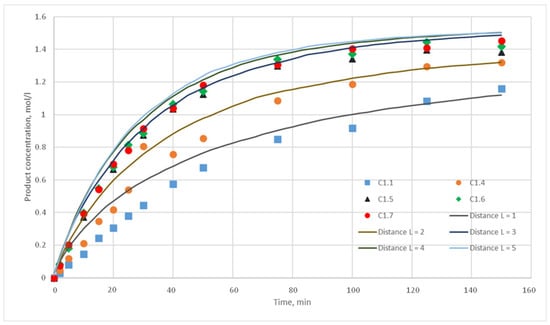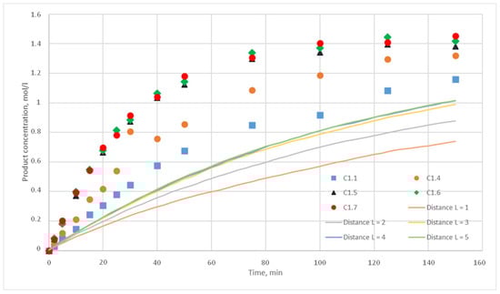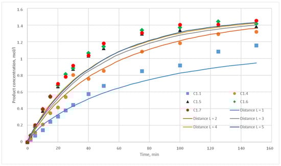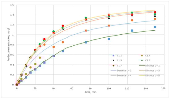 The value for the reaction probability p should be selected as the value corresponding to the smallest deviation of the calculated curves from the experimental curves. For the temperature of 130 °C, this value is 0.020. With such a p value, curves with different distances of L have the smallest deviation from the experimental ones. In addition, L values corresponding to various values of the stirring speed were obtained. Thus, for 130 °C in the developed model, the probability of reaction p is 0.020, and the values of L are 1, 2, 3, 4, and 5 for stirring speed of 300, 350, 400, 450, and 500 rpm, respectively. With these parameters, the deviation of the calculated curves from the experimental curves of the C1 series experiments does not exceed 14%.