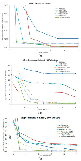 Many transportation and other problems (e.g., clustering problems related to computer vision) require online computation within a fixed time. As mentioned above, Lloyd’s procedure, the most popular k-means clustering algorithm, is rather fast. Nevertheless, for specific data sets including geographic/geometrical data, this algorithm results in a solution which is very far from the global minimum of the objective function (1), and the multi-start operation mode does not improve the result significantly. More accurate k-means clustering methods are much slower. Nevertheless, recent advances in high-performance computing and the use of massively parallel systems enable us to work through a large amount of computation using the Lloyd’s procedure embedded into more complex algorithmic schemes. Thus, the demand for clustering algorithms that compromise on the time spent for computations and the resulting objective function (1) value is apparent. Nevertheless, in some cases, when solving problem (1), it is required to obtain a result (a value of the objective function) within a limited fixed time, which would be difficult to improve on by known methods without a significant increase in computational costs. Such results are required if the cost of error is high, as well as for evaluating faster algorithms, as reference solutions.