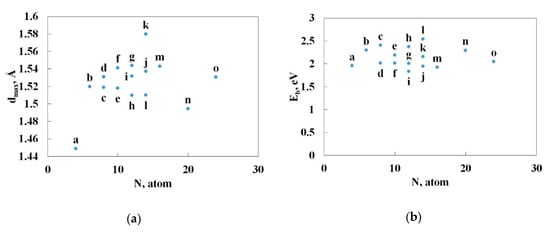 We found that the hexagon/pentagon and the pentagon/pentagon were the only stable configurations with positive eigenfrequencies. Other structures are not true energy minima. Potential energy paths corresponding to the breaking of joint hexagon/pentagon and pentagon/pentagon bonds are shown in Figure 1b,c (the energy barriers are 0.58 and 0.47 eV, respectively). Therefore, the pentagon/pentagon interface seems to be the most suitable. The hexagon/pentagon interface possesses lower stability, while the adjacent hexagons lead to complete instability. It should be noted that the carbon structures exhibit the opposite behavior, avoiding adjacent pentagons according to Kroto’s isolated pentagon rule [43].