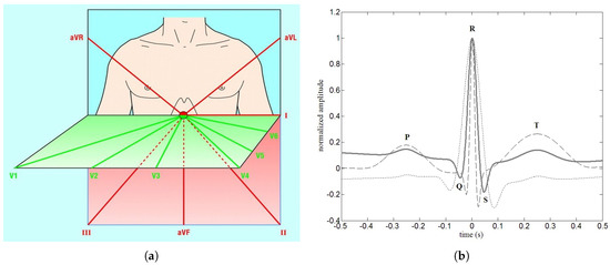 An originates following the atrial and ventricular contractions where the concentrations of the sodium and potassium ions are unbalanced so that the heart muscle, being electrically charged, is equivalent to an electric dipole vector with amplitude and variable direction during the depolarization and re-polarization of cells [8,17,27,28,29]. The electrical behavior of a single pair of ions produces an electrical dipole. All the electric dipoles determine a single resulting vector called Heart Dipole Vector (HDV), , where t is the time variable. Then, an derives from the scalar product between and the direction of the axis of the recording electrode, , generating the so-called Heart Dipole Model (HDM). On these premises, an consists of 12 different leads describing the same vector at the same instant t but from different points of view. reconstruction requires the analysis of its projection in several different leads, to identify its spatial arrangement within the heart. The electromotive forces are best recorded on the horizontal plane (left to right, parallel to the horizon) and on the vertical (frontal) plane, perpendicular to the shoulder line, from head to toe. Running an includes the following leads (Figure 1a) [30,31]: (1) six vertical leads (on the frontal plane): (a) bipolar leads of the limbs: I, II, III (Standard leads); (b) uni-polar leads of the augmented limbs: aVR, aVL, aVF (Goldberger leads); (2) six horizontal branches (on the horizontal plane). Uni-polar or chest wall precordial leads: to or (Wilson leads). Uni-polar leads are recorded by coupling a single electrode with a central terminal, while bipolar leads record the potential difference between two electrodes. Leads I, II, II are bipolar; leads aVR, AVL, aVF, and Wilson leads are uni-polar [30,31,32,33].